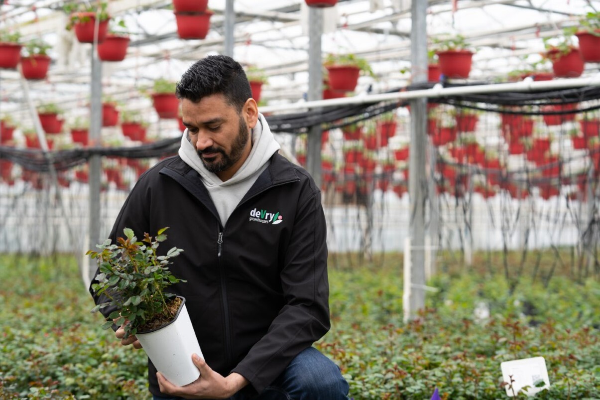Rajvir Prasher, Growing Director at DeVery Greenhouses inspects plants in one of DeVry’s many greenhouses. As DeVry’s footprint continues to grow and diversify, Argus environmental controls help ensure every plant meets the same high standard for quality and consistency.