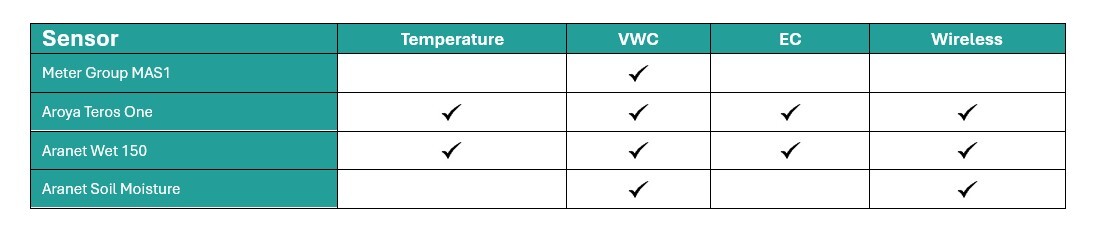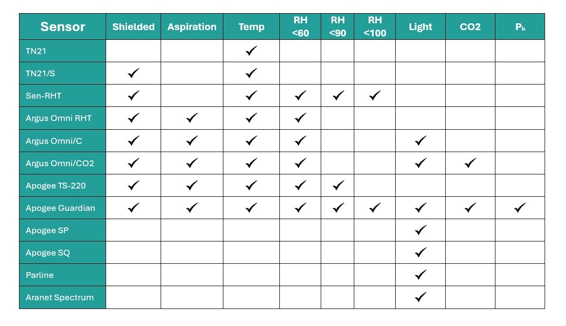 The above charts addressing climate, soil and outdoor sensors are the most commonly used sensors by Argus clients but only a sampling of the myriad sensors that companies like Meter Group, Aranet and Aroya manufacture. The Argus TITAN system is capable of interfacing with most third party sensors.