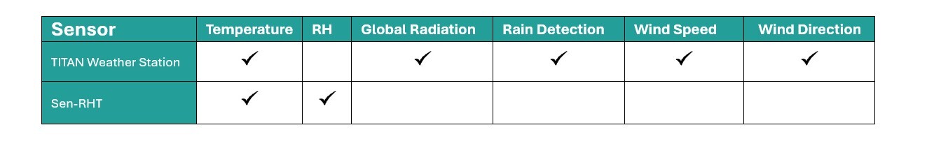 Outdoor sensors are commonly referred to as outdoor weather sensors or weather stations. They are used for measuring outdoor influences on the growing environment, particularly greenhouses where outdoor conditions have a significant impact on climate inside greenhouses. For example if one wants to change indoor humidity levels, measuring outdoor humidity can help the climate controller determine the best strategy such as heating indoor air and venting or bringing outdoor air in:
